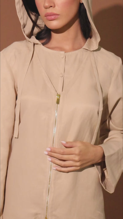 A modern hooded top defined by clean tailoring and a refined zip-front closure. Crafted in a premium viscose-linen blend, it balances practicality with a sculpted, elongated silhouette.